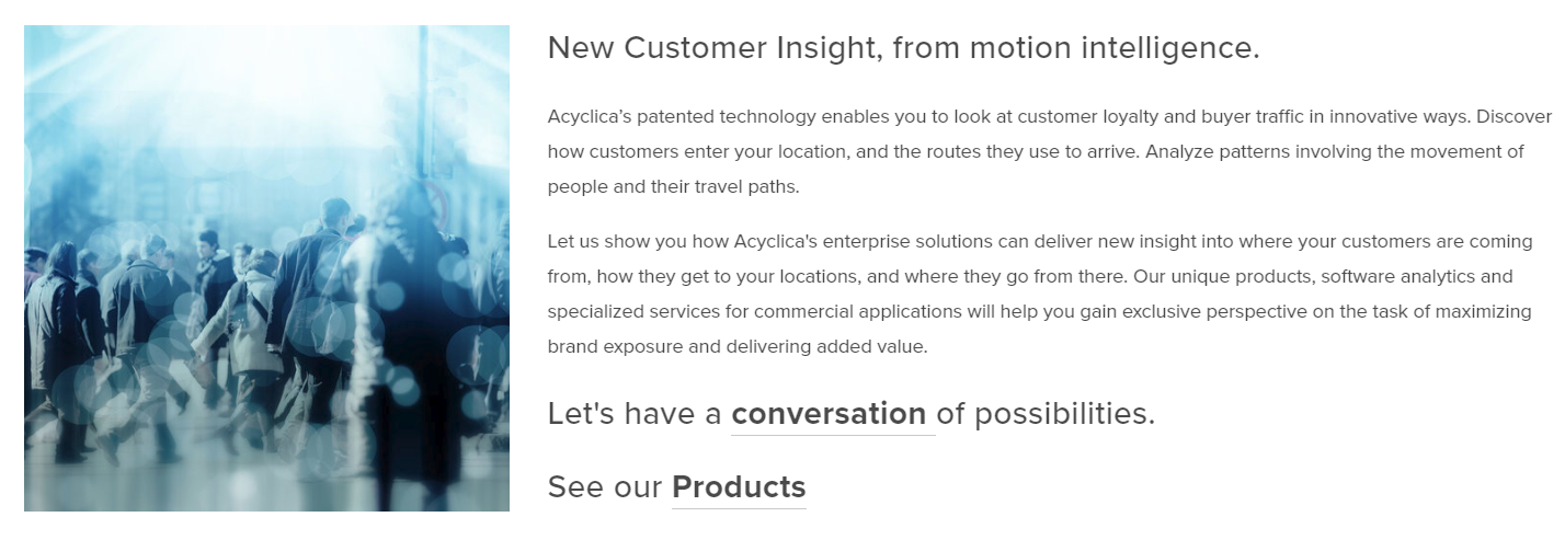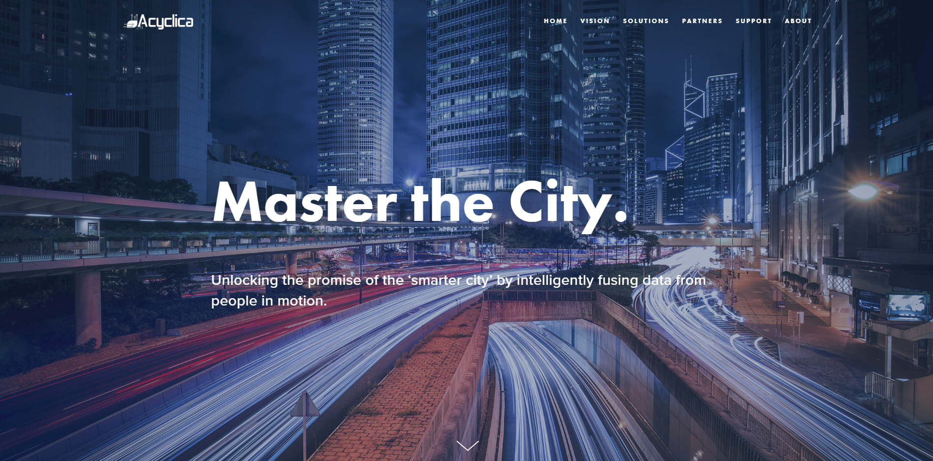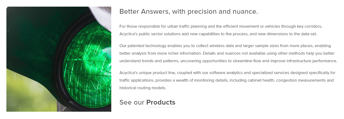 As Marketing Consultant, I created new messaging, competitive positioning and a website for this producer of unique technology to measure and analyze the way traffic flows and people move. With deep expertise in traffic signal timing, data analysis and cloud integration, Acyclica unlocks the promise of the ‘smarter city’ for municipalities around the world.